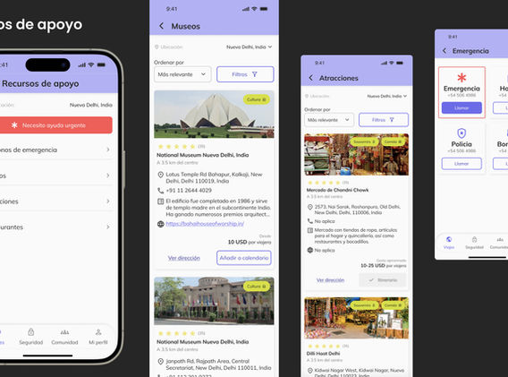 More focused on users who have already booked their trip through the website. They will find everything related to their trip: flights, tours, itineraries, other women traveling to the same place, restaurant or location suggestions, as well as emergency numbers, embassies, etc. The goal is for users to be able to share their location with trusted contacts. Additionally, when entering areas categorized as dangerous, they will receive a notification on their phone.